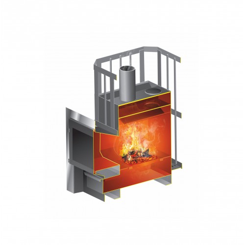 Банная печь "Катунь" создана на базе имеющихся моделей банных печей группы «Сибирь», имеет технические доработки и современные инженерные решения. Данная печь рассчитана на обогрев парильного и смежного помещения объемом от 12 до 24 м3. Отличительная черта данной печи заключается в объединении мощи металла и крепости камня. Печь доработана технологически, в нее внедрена система вторичного дожига отходящих газов, что позволяет сократить потери тепла при топке и увеличить скорость нагрева камней в печи. Мы сохранили добрую традицию делать банную печь из стали толщиной 6 мм, что позволяет использовать в качестве дополнительного источника топлива бурый уголь. Это также делает данную печь долговечной, способной функционировать в самых суровых условиях, оставаясь при этом надежной и эффективной.