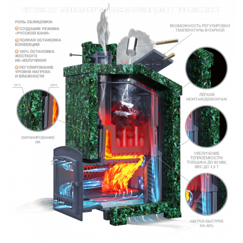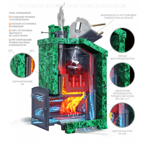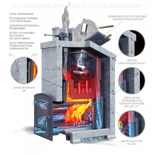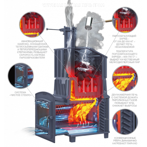 Главная особенность: Уникальная каменка прямого нагрева новейшего поколения. Несмотря на внушительную массу, она выходит на рабочий режим в 2 раза быстрее стандартных моделей и держит жар часами благодаря массивному чугуну (толщина стенок топки — 14 мм).