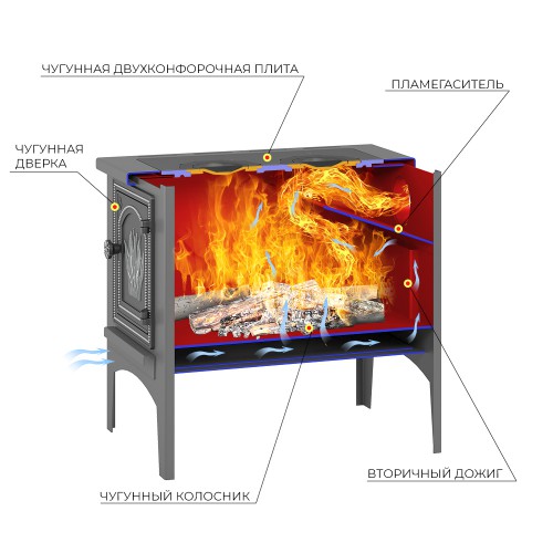 Верхнюю горизонтальную поверхность можно использовать для приготовления пищи. Печь укомплектована чугунным колосником и чугунной негерметичной дверцей Везувий ДТ-4. Печь облицована керамической плиткой для лучшего распределения тепла.