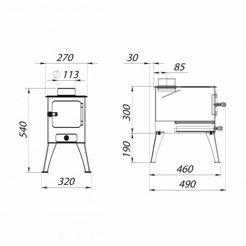 Одна из самых компактных в ряду отопительных печей. Обладает небольшими размерами, эргономичной формой и простым управлением. Возможность разогрева и приготовления пищи характеризует изделие, как эффективный и полноценный отопительный аппарат для садового домика и помещений объемом до 50 м³