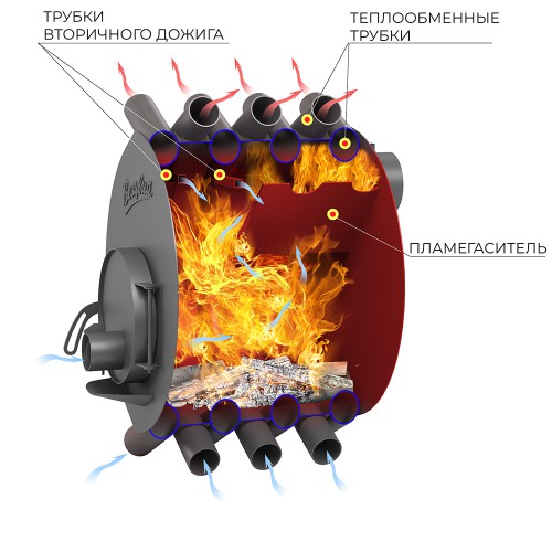 Две камеры сгорания, нижняя камера газификации и верхняя камера дожига газов, обеспечивают практически полное сгорание топлива и получение максимального количества энергии во время работы печи.