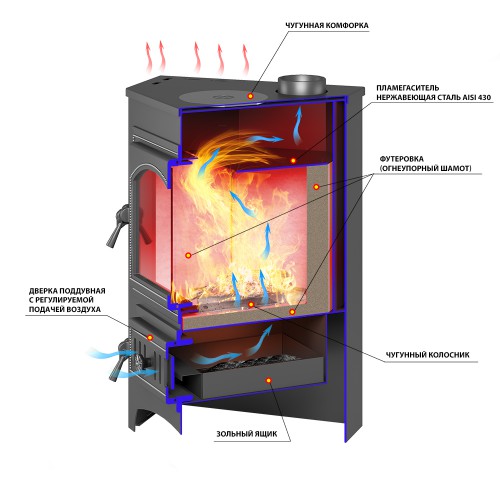 · Надежность и долговечность: Корпус выполнен из особо прочной котловой стали марки 09Г2С. Топка футерована высококачественным шамотом (огнеупорным кирпичом), который защищает стенки от прогорания, аккумулирует тепло и равномерно распределяет его по комнате. Керамические боковые вставки дополняют интерьер и повышают теплоотдачу.